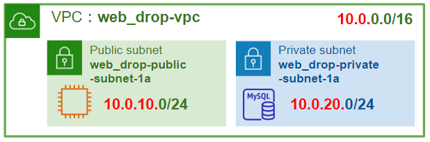 今回は、VPCの作成とその中に二つのサブネットを作成しました。現在の構成イメージは、下記のようになります。